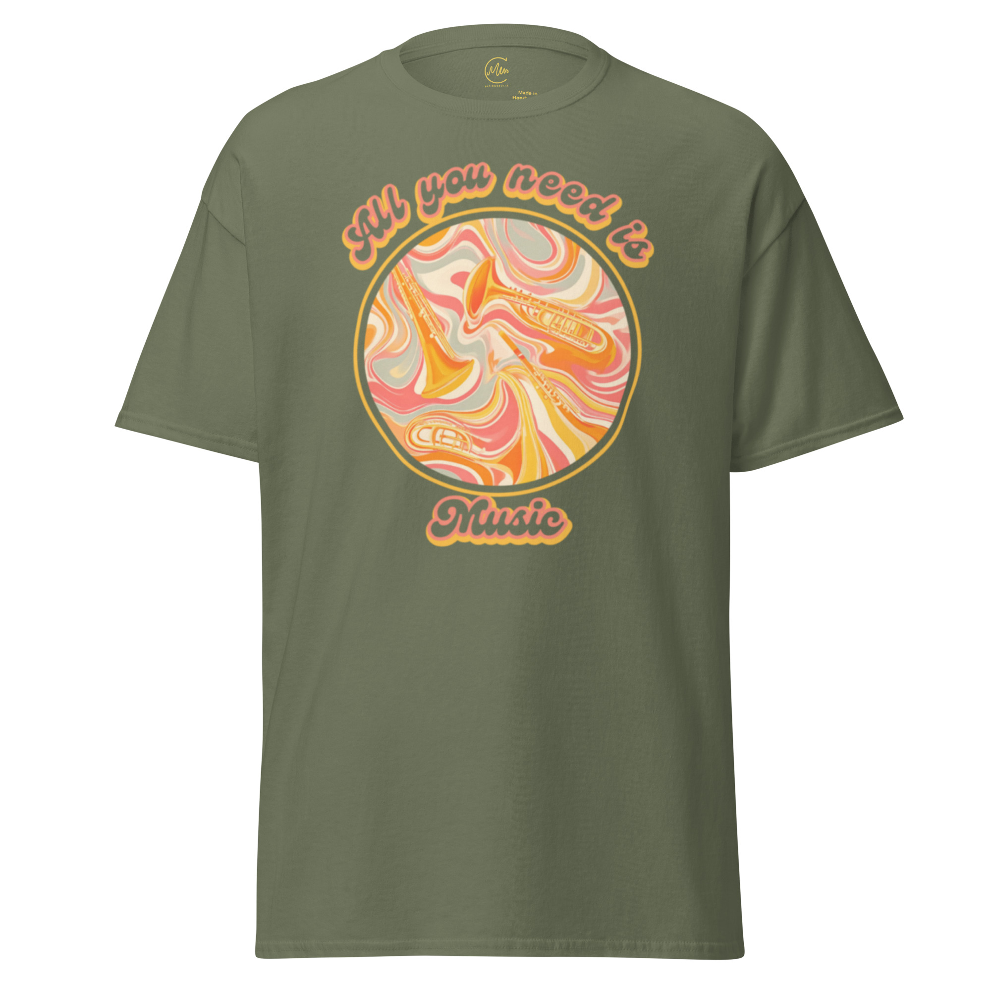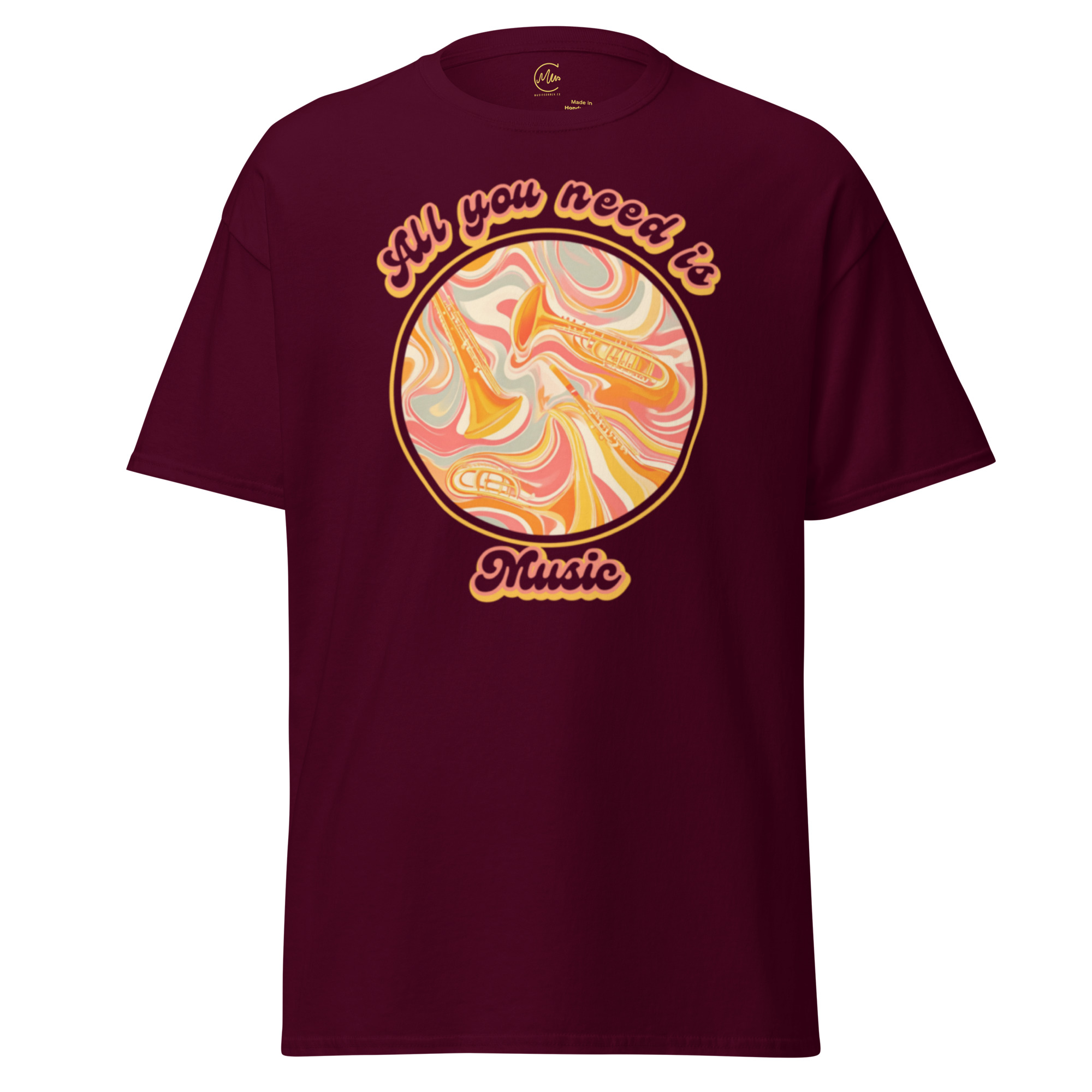 La música lo cambia todo: transforma tu estado de ánimo, conecta con tus recuerdos y te acompaña siempre. Esta camiseta con la frase “All you need is music” y una ilustración circular con instrumentos de viento es un recordatorio de lo esencial que es la música en la vida de quienes la sienten de verdad.